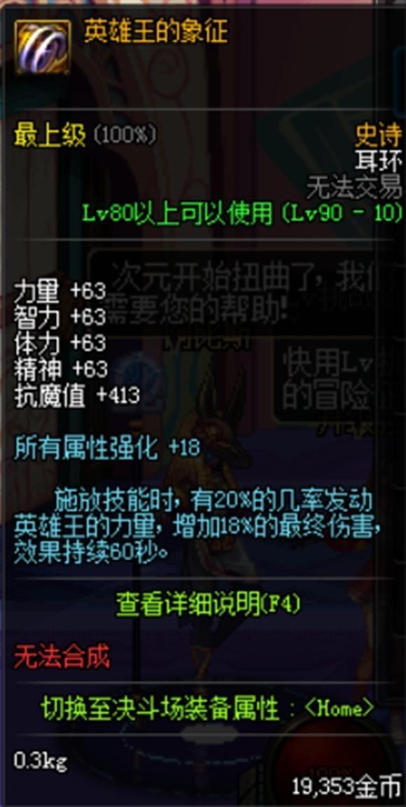 地下城与勇士(英雄王的象征)属性:增加伤害18强化增加18外观华丽